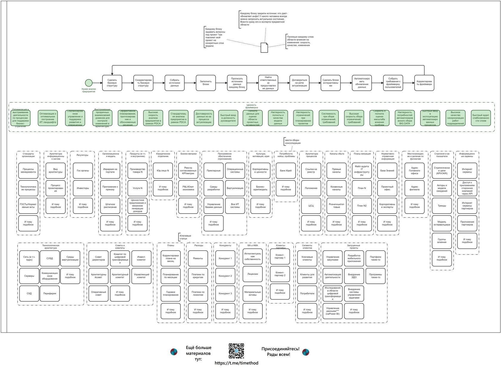 И придумал шаблон, который стал наполнять в течение 2-ух недель на каждой из работ. Каждому блоку сразу закреплял ФИО ответственного за источник данных для будущих уточнений-детализации (и договаривался с ним о тайминге актуализации). Каждый блок становился интерактивным – в него можно было проваливаться за счёт функционала CAMUNDA или быстро переходить по гиперссылкам на конкретный источник данных. После заполнения шаблона его пиарил: ко мне отсылали всех новых сотрудников, старых интересующихся - все они попадали ко мне на вербовку